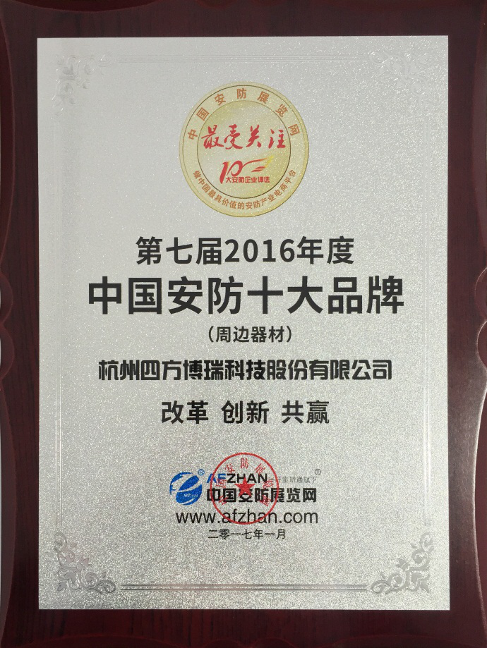 杭州四方博瑞科技股份有限公司榮獲“周邊器材類-第七屆2016年度十大安防品牌”榮譽(yù)稱號(hào),公司產(chǎn)品“天網(wǎng)監(jiān)控綜合控制器”獲得“第七屆2016年度十大安防品牌-創(chuàng)新產(chǎn)品獎(jiǎng)”榮譽(yù)稱號(hào),兩項(xiàng)榮譽(yù)的獲得彰顯了四方博瑞的專業(yè)水平和絕對(duì)競(jìng)爭(zhēng)優(yōu)勢(shì)。
